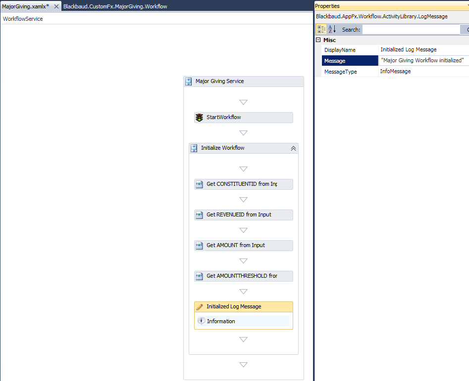 Drag the LogMessage activity from the Major Giving Service Sequence Activity into the Initialize Workflow Activity.