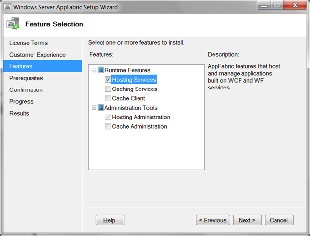 From the Windows Server AppFabric Setup Wizard, from Features, select Hosting Services.