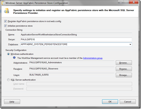 Figure: Windows Server AppFabric Persistence Store Configuration