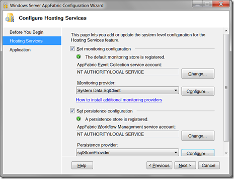 Use the Windows Server AppFabric Configuration Wizard to set up the system wide monitoring and persistence stores for AppFabric. The screen shots that follow show the appropriate settings. For more information about the Windows Server AppFabric Configuration Wizard, see the MSDN article at Windows Server AppFabric Configuration Wizard UI Reference.