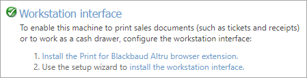 The workstation interface is a browser extension or add-on that enables you to open the cash drawer and print tickets and other sales documents from Altru. Use the installation utility on the Print Setup page to install the interface on each computer you will use as a workstation.