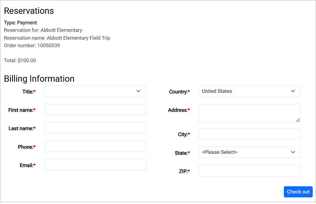The patron receives an email with a link to your organization’s online checkout page, which is valid for 24 hours. After entering billing details, they complete their payment through the secure checkout form and receive an acknowledgement email.