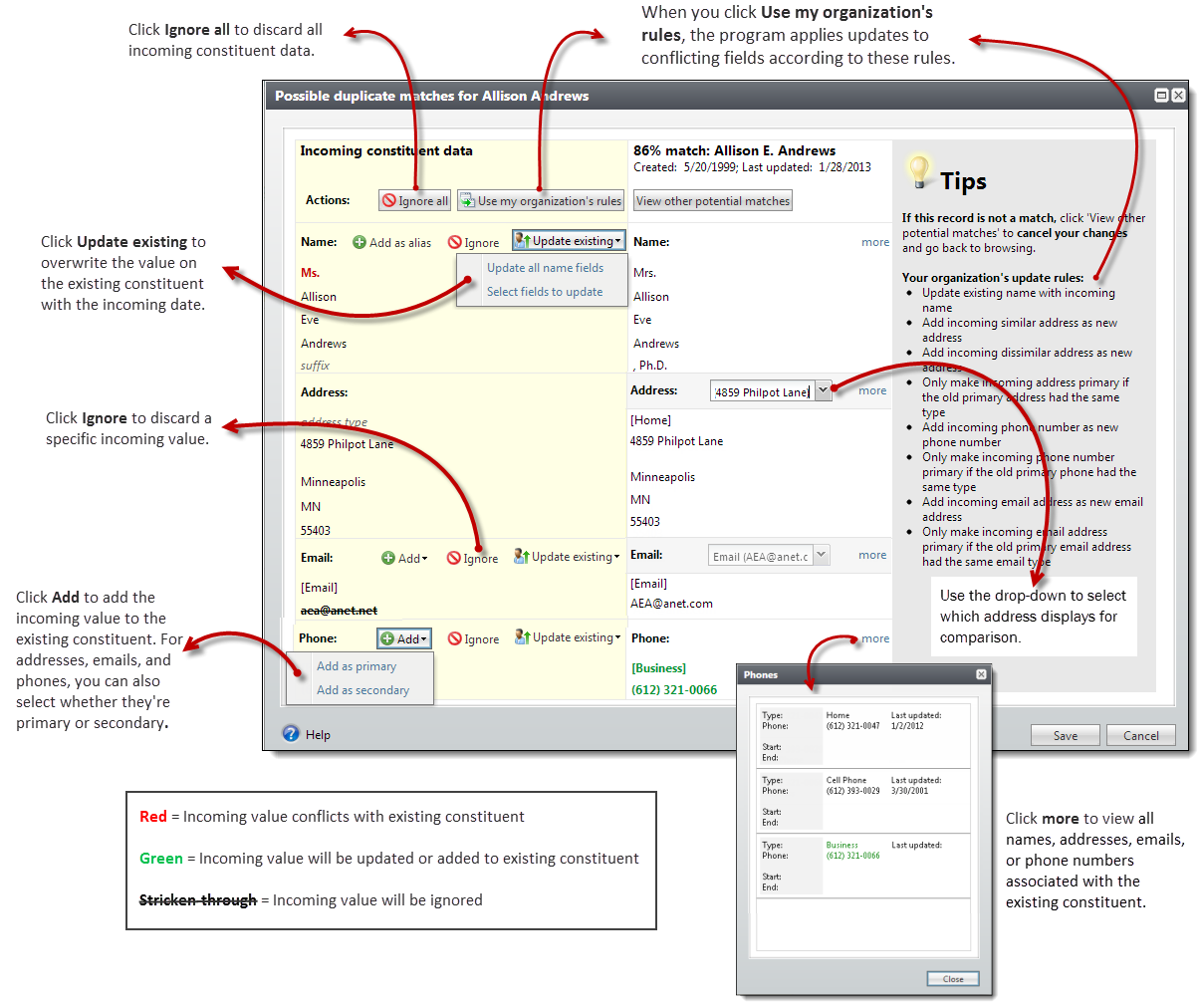 To automatically apply the constituent update rules set on the Global data entry page of Administration, select Use my organization's rules. For example, when you have Add incoming phone number as new phone number set as a rule, and you select Use my organization's rules, the program automatically adds the incoming phone number to the existing record. When your update rules require manual review for certain fields, you must review those incoming fields and manually select which action to take. As a reference, your organization's selected update rules appear in the Tips column. For information about constituent update rules, refer to Configure Constituent Update Rules.