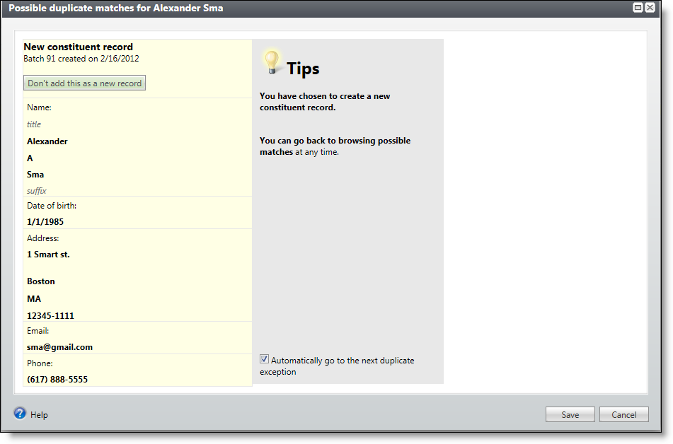 Note: When you select Automatically go to the next duplicate exception, the program automatically opens the next record in the batch with possible matches when you select Save.