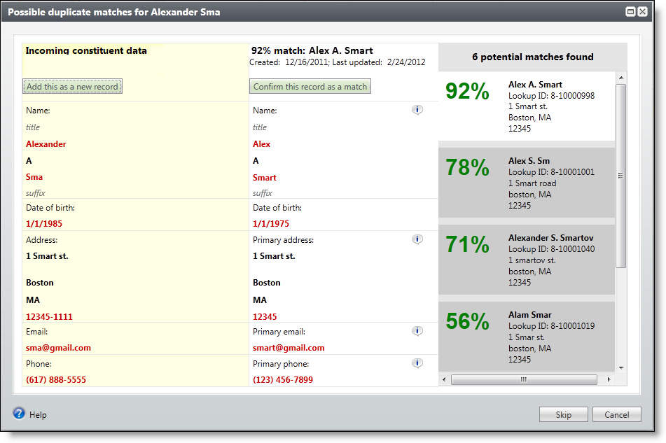 When you select a constituent in the Potential matches column, its information appears in the middle column so you can compare the incoming and existing records side-by-side. Black fields are exact matches. Red fields are similar but need careful review. After you compare the records, you can do one of the following: