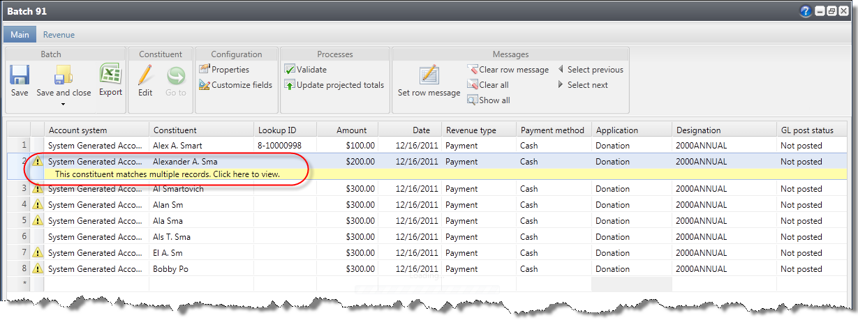 When you validate a Constituent, Revenue Batch, Revenue Update Batch, or Enhanced Revenue Batch, the program automatically runs a duplicate check to find any existing constituents that may match constituents in the batch. When the match confidence score for a pair of constituents falls within the range defined for possible matches, the program flags the incoming record as a potential duplicate and displays an exception in the batch data entry grid. To view information about the possible duplicate, select the message and use the duplicate resolution screen to decide whether to update the existing constituent or add a new constituent record.