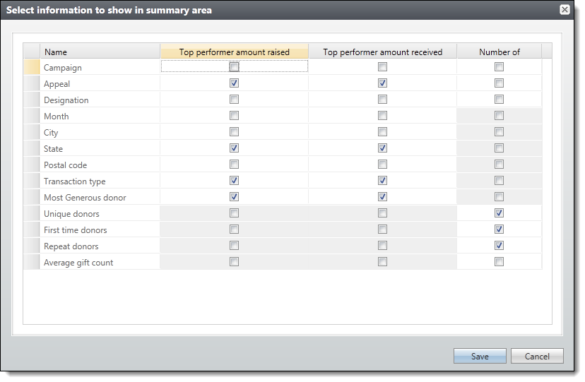 At the top of the Giving List report, a Summary section displays. You can select Summary information to select the information to include, such as the top performers by campaign, month, or city. Top performers can be listed by amount raised or amount received.