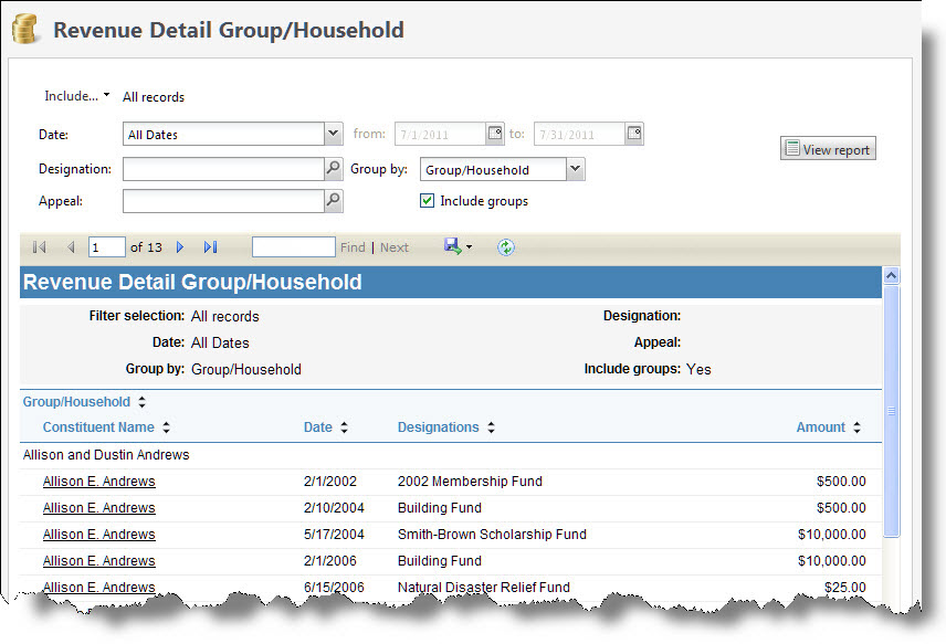 The Giving Detail Group/Household report provides information about individual group or household member giving during a time period you define. The report includes totals of revenue received within the date range for each designation, as well as constituent name and group/household information. The data included in the report depends on the parameters you select.
