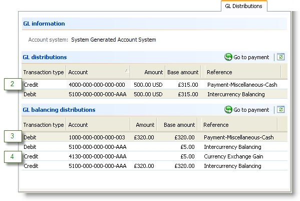 You create a miscellaneous payment on 7/1/2011 for 500 USD. Your exchange rate for USD to GBP on 7/1/2011 is 0.63.