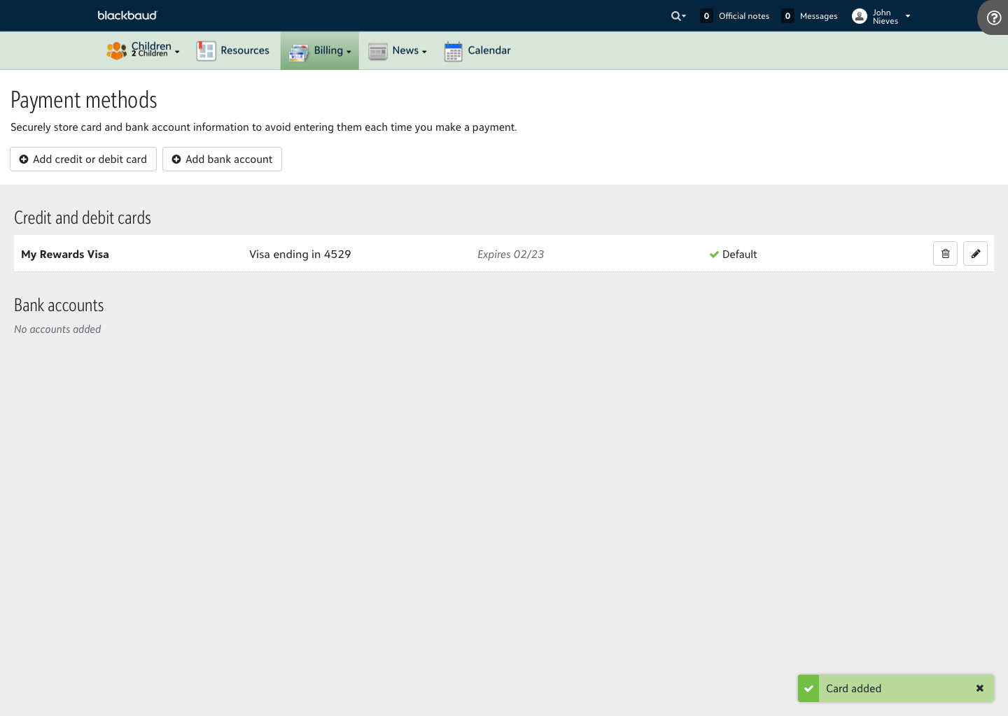 Save payment methods to speed up making payments for your Current bill. Payment methods are limited to those supported by your school, and may include credit cards, debit cards, and bank accounts.
