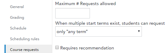 Teachers (Non-advisors or managers) - Academics > Requests and schedules > Course Request Setup > Term Settings > Select Teachers, or another user type, under Recommendations for specific terms and grade levels.