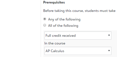 Step 2: Course Prerequisites CoursePrerequisites establish barriers to ensure students meet the competencies required to request a course. Note: If you are using prerequisites within your course requests, please read the following section titled Prerequisite Overview to help ensure they are properly set-up. |