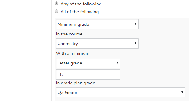 To prevent students with unearned competencies from requesting courses, associate prerequisite conditions with courses. For example, let's explore the usage of the prerequisite Minimum Grade. The Minimum Grade prerequisite check looks at students’ grades in a corresponding course, and if the grade they received is, or is higher, than the Minimum Grade, then the students' may request the course. Note: Note: Ensure that your Minimum Grade matches a grade in the courses’ corresponding Grade Translation Grade Translations are grades (such as A, B, C, D, or F) and the criteria associated with them for use in GPA calculations. table. If you have questions, work with your school’s Grading Manager or assigned Blackbaud K-12 Grading Consultant. |