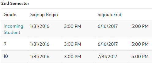 Term Settings determine when each user type can create course requests, how long they can submit requests, and how many course requests they must select per term. Each grade level can have different Signup Begin and End dates and different Minimum and Maximum course enrollment counts. Tip: Learn more about Course Requests Setup. |