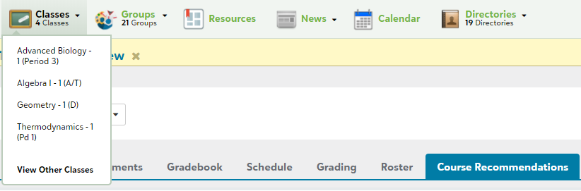 Step 1Navigate to the class page and select Course Recommendations. A teacher can only to make recommendations to students currently enrolled in a course they are teaching. |