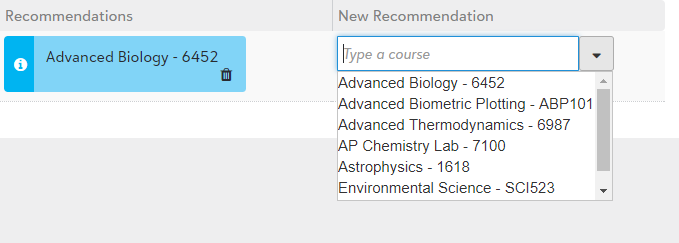 Step 2Identify a student, and in the corresponding row, under Recommendations, type in the name of a course to recommend. Teachers can recommend students to any course categorized within the department categorized within the course they are making the recommendation. For example, if a teacher makes a recommendation from Anatomy - categorized under Sciences - they can make recommendations to other courses within the same category, such as Advanced Biology, Astrophysics, and Environmental Science. |