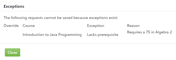 Step 2Select as many courses as required on the course request policy, and select Save. If Show Message is set under Lacks prerequisite in Course Request Settings, then a message will appear informing the student of necessary competencies required to request when the user selects Save. Teachers can override this check, but students cannot. Students can override the prerequisite check message for Has already taken the course and Assigned to a different grade level than the course. |