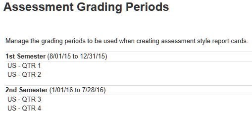 The Assessment Grading Period is the link between the grades you record in courses and the report card itself. When creating an Assessment Report Card, you will specify an Assessment Grading Period to draw data from. Create an Assessment Grading Period for each instance during the semester where Assessment report cards are issued; if you issue Assessment Report Cards once a quarter, and you have four quarters in a school year, then create four Assessment Grading Periods. |