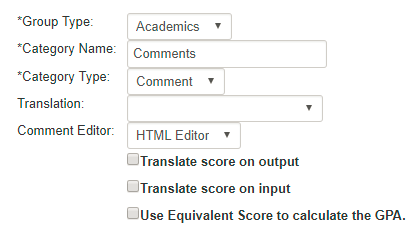 Grade Categories can be used to collect comments from teachers. Comments can appear on report cards. Comment Grade Categories do not need a translation table associated with them. Create one Grade Category called Comments if you record comments; the Comments Grade Category can be used across multiple Grade Plans. Note: If your teachers copy and paste comments, then ensure Plaintext is selected for Comment Editor. Tip: Read more about Grade Categories |