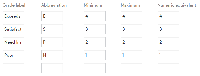 If your school does not use GPA calculations or a numeric grading schema, then Grade Translations can be used to describe skills (Exemplary, Satisfactory, Improving, etc).