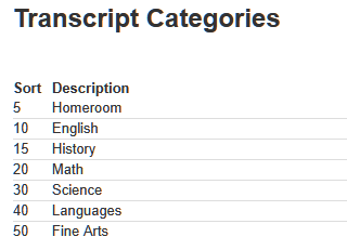 Academics > Grades > Transcripts setup > Transcript categories Transcript Categories determine how courses are grouped together on a transcript.