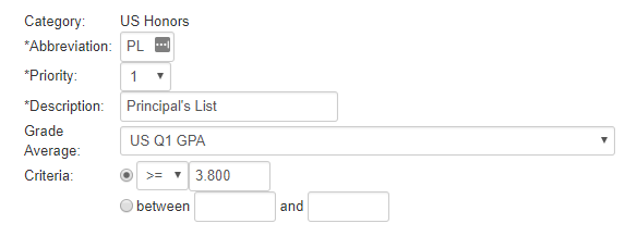 Step #2:Each subcategory must be assigned a means for comparing the GPA with a standard. Select the threshold that should be reached by the student to achieve the academic performance designation. In this example, Principal's List is set to a higher threshold requirement. If a student meets that threshold, and because Principal's list has the higher priority, the student will appear on the Principal's List and not the Honor Roll. |