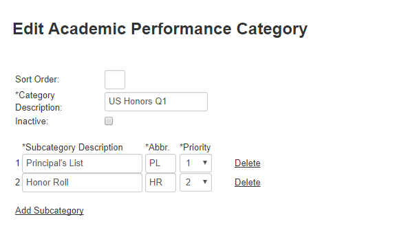 Step #1:Academic Performance can be used to compare students' grade averages against a metric you define. The outcome can range anywhere from a list of Probation-ranked students to assessing Honor Roll worthiness. You can associate similar Academic Performance measurements with one another. For example, President's List and Honor Roll can be subcategories within the same category, because they similarly reward success. The priority will determine which Academic Performance measurement is used if a student meets more than one requirement. In this example, a student would receive the Principal’s List designation if they met that requirement because of its higher priority. |