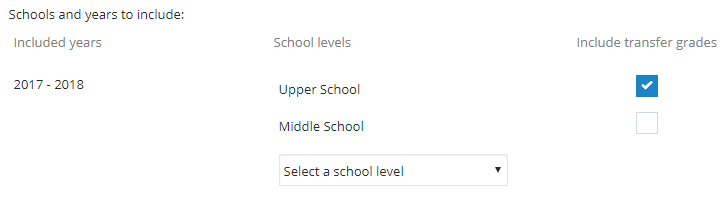 Step #2: School YearsSelect the School Years you want to include in the GPA calculation. If you want final transfer grades to be included, check the include transfer grades checkbox. |