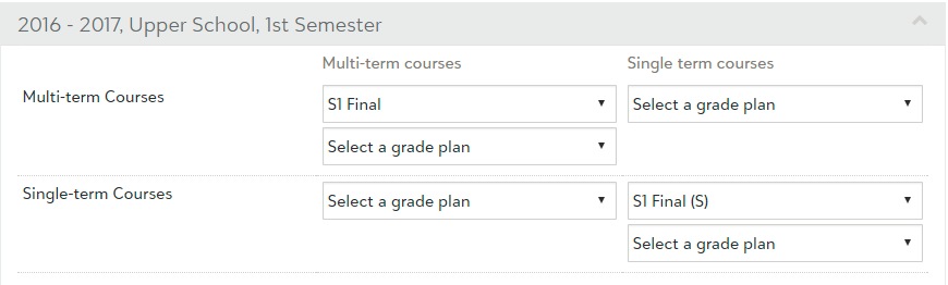 If you follow a Final Grade setup and have courses that are segmented into Multi-term and Single-term Grade Plan Groups, then you must ensure that you only select a Grade Plan within the corresponding column. For example, in the row containing your Multi-term Grade Plan Group, under the Multi-term courses column, select the Grade Plan that contains your Final Grades. Repeat the same steps, but for your Single-term Grade Plan Group next. Tip: Read More about GPA Calculation Formulas |