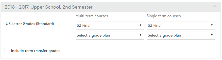 Step 3#: Grade PlansIf your Grade Plan Groups are not differentiated by term (for example, multi-term and single-term Grade Plan Groups), then simply select the Grade Plan to be used in determining the GPA for both the Multi-term courses and single-term courses columns. If you'd like to include term transfer grades check the box for Include term transfer grades. |