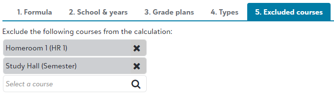 Step #5: Excluded CoursesExcluded Courses are courses that are not included in GPA calculations. Study halls and Homerooms, for example, may fit into this category. Courses do not need to be excluded if they are not in a Grade Plan selected in the previous step. |