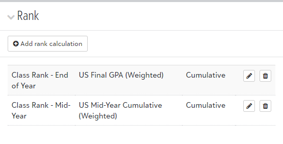 Ranks use either the Cumulative, Term, or the Year to Date value calculated using a specified GPA calculation formula to display information on a transcript. Final grade schools need different grade average formulas for mid-year vs end-of-year, often because the Semester 1 grade for year-long courses should be counted in the cumulative grade at the mid-year, but only the final at the end-of-the-year.