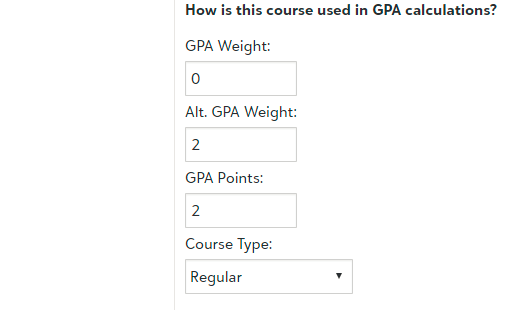 Step 3: GPA Weight DeterminationWeight influences GPA calculation. If you offer AP/Honors courses that are graded on the same scale as standard courses (4.0, for example), then give standard courses a weight of 1 and AP/Honors an appropriate bump. For example, students might get a .5 bump for AP courses, and a .3 for honors; this can be stored in the GPA Weight/Alt Weight fields in the Course. |