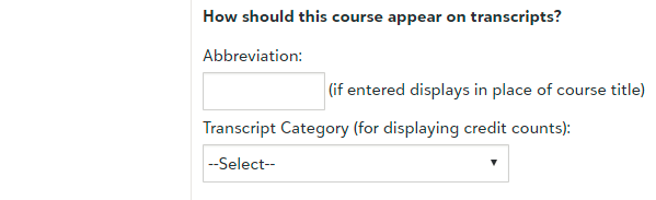 Step 4: Transcript OrganizationEnter an Abbreviation if the Abbreviation of the course should take place of the course name on the transcript. Enter the Transcript Category to determine how the course is organized on the transcript. Note: An Abbreviation is best used if the course title is too long and does not appear on transcripts fully. |