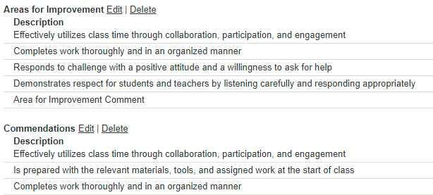 AssessmentUsed to associate Assessment Skills (i.e. Working with others) with Grade Translations. Does not contribute to GPA calculation. Linked, often, with Lower School courses. |