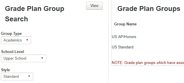 There are two categories of Grade Plan Groups: Assessment and Standard. Each type has a different purpose for associating a different set of information with a course. Grade Plan Groups are unique to School Level; you cannot associate a Middle School Grade Plan Group with Upper School courses.