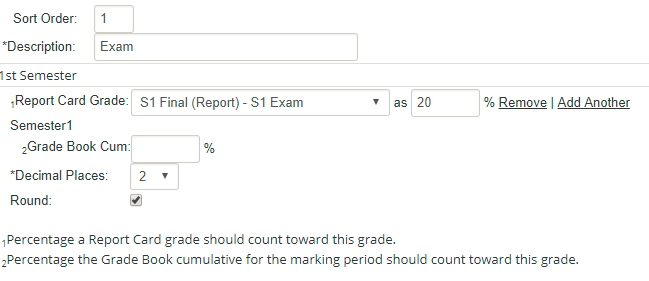 For example, if final exams count as 20% of the semester grade, you can add the final exam as a numeric Grade Plan Grade and create a formula which pulls 80% from the gradebook cumulative and 20% from the exam grade. If some teachers do not give a final exam, you can make the exam grade optional in the Grade Plan and the formula will ignore the grade if it is blank – leaving 100% of the semester grade pulling from the gradebook. If some departments or teachers use different formulas when calculating the semester exam you can add multiple formulas to account for those differences. You might end up with a formula that factors in the exam grade as 15% or 25%. If you do not enter a formula teachers will be able to create their own formulas; they cannot do this if a formula has been created by the Grading Manager.