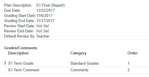 Grade Plan Grade Grade Plan Grades are what you allow teachers to record during a Grade Plan, whether they are comments or standard grades. If Grade Plans are like buckets, then Grade Plan Grades are like the contents of those buckets.s are what you allow teachers to record for that period, whether that be a comment or a standard grade. If Grade Plans are akin to buckets, then Grade Plan Grades are the contents of those buckets. Grade Plan Grades are linked to your Grade Categories and, therefore, your Grade Translations, are added to report cards and transcripts. |