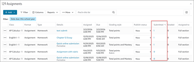 In list view of the Assignment Center and class Assignments pages, a new Submitted column shows how many students have turned in online file or text submissions for an assignment. Teachers can select the Submitted number to open a flyout that displays each student in the class, their submission timestamp, and gradebook indicators (e.g., Missing, Submitted before due date, Submitted after due date, etc.)