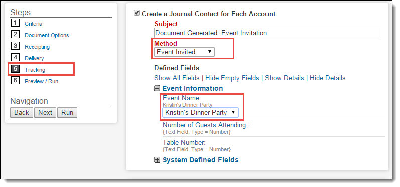 To generate letters in bulk, you will need to set up a communication template to define what the document should include and how it should look. Then, you will create a query to group the accounts or journal entries that should receive the document. You can access the option to create a journal contact to track Event Invited information on the tracking step. For more information about using query to generate documents in bulk, refer to Use Query to Generate Documents in Bulk.