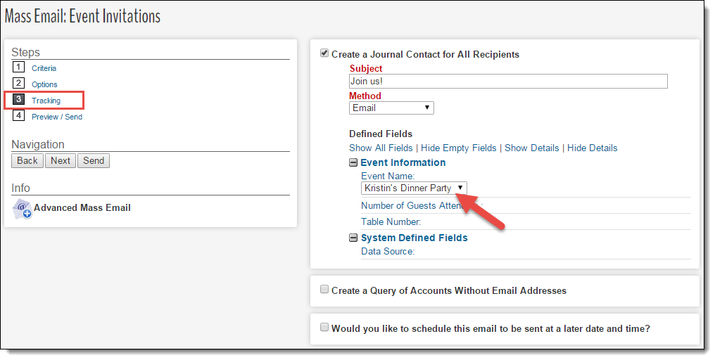To generate a mass email, you need a communication template that contains the email content and a query that includes the accounts of the intended recipients. You can access the option to create a journal contact to track Event Invited information on the tracking step. For more information about generating mass email, refer to Generating Mass Email.