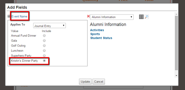 Within the settings, you can also utilize hidden fields to mark the submissions as tickets for that specific event. In this example, we are having an event called “Kristin's Dinner Party,” so that value has been marked. Hidden fields allow you to decide how the transaction is marked without having the donor click anything on the form. For more information, watch this short video on how to use hidden fields to mark submissions as tickets for an event.