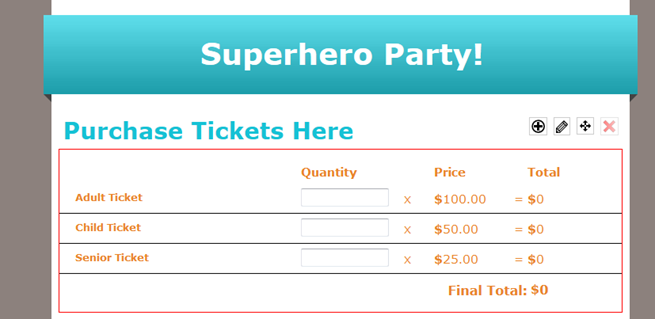 Now that you have all of your fields set up, we can start creating your Event Registration DIY Form. The Event Registration page allows you to sell multiple types of tickets for the same event. For example, if you will have an “Adult Ticket” and “Child Ticket” that will each have different prices, you can add each ticket type to the form, and the donor can fill in how many of each they want to purchase. The total will calculate based on how much each ticket costs and how many they want.