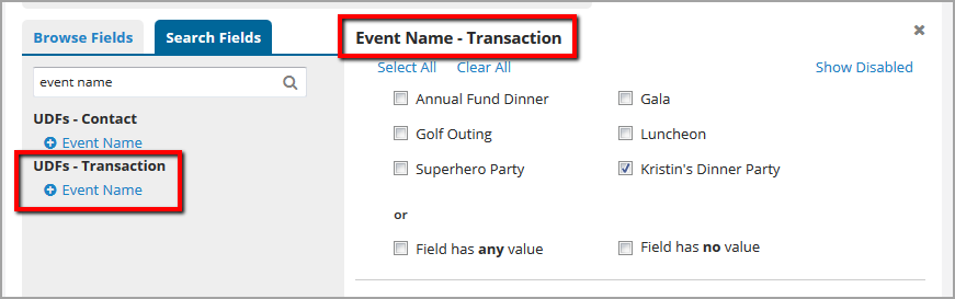 For example, if you want to find any donation from an event, you would query on the Transaction field instead of the Contacts field, since journal entries for donations are considered transactions and not contacts.