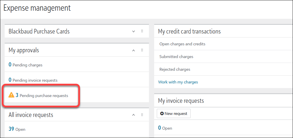 After selecting the number next to Pending purchase requests, transaction details for the purchase requests assigned to you display.
