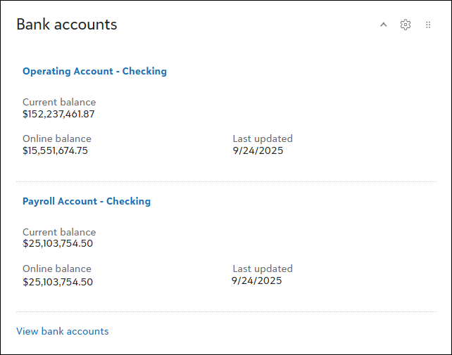 Use the Bank accounts tile to display up to five accounts. This allows you to monitor details such as current balances and the date each account was last updated.