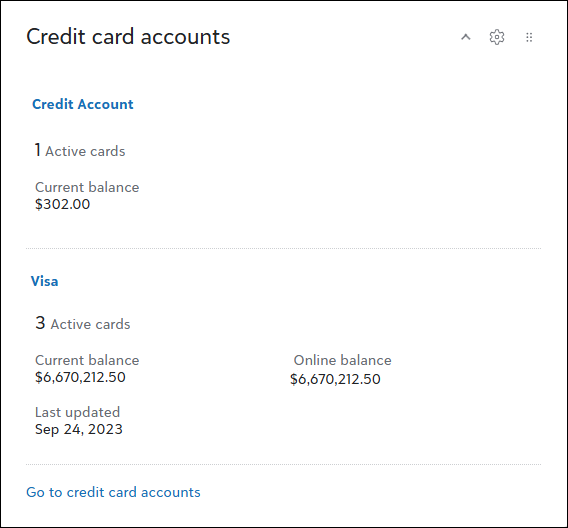 Use the Credit card accounts tile to display up to five accounts. Quickly review important details such as the number of active cards and current balances.