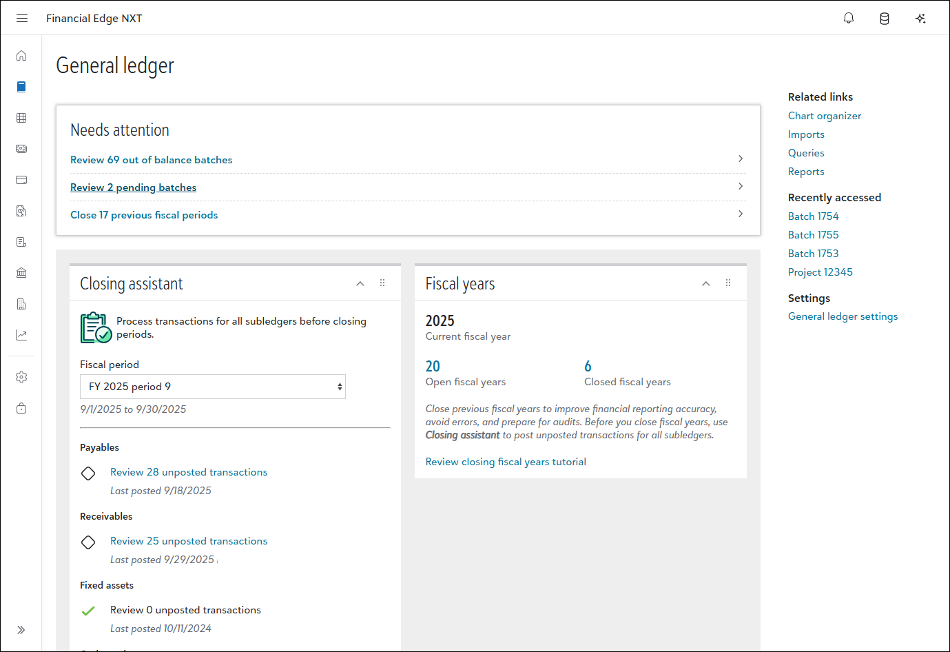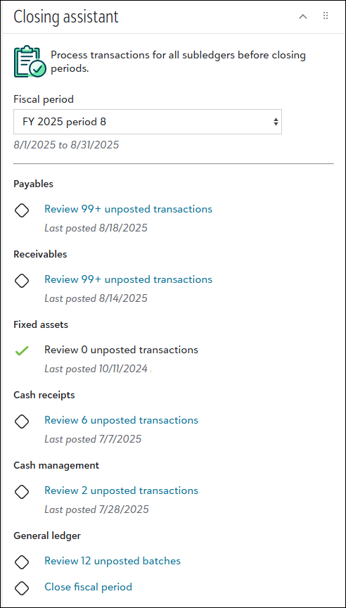 Use Closing assistant to stay on top of posting transactions for each subledger. Regularly reviewing and processing unposted batches helps maintain accurate financial records and allows you to close fiscal periods that no longer need to remain open.