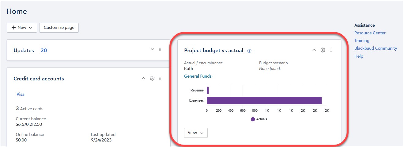 From Home, use the new Project budget vs actual tile to monitor real-time budget and spending for your projects without navigating multiple reports. Quickly assess financial performance by selecting a project, choosing to view actuals, encumbrances, or both, and specifying the budget you want to track.