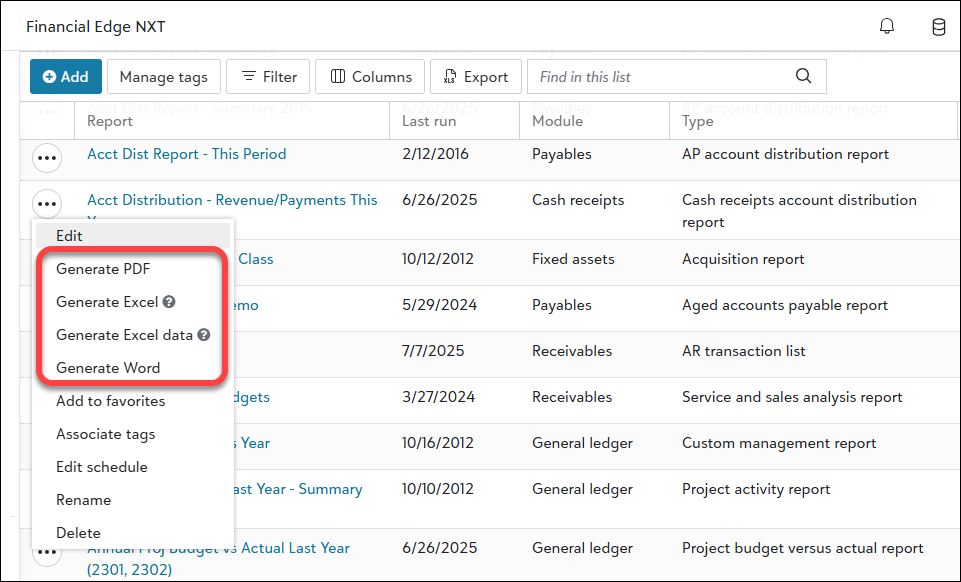 Also, report options have changed. Run and Export have been replaced with four new Generate options that streamline the report generation process, making it easier to select the format that best fits your needs.